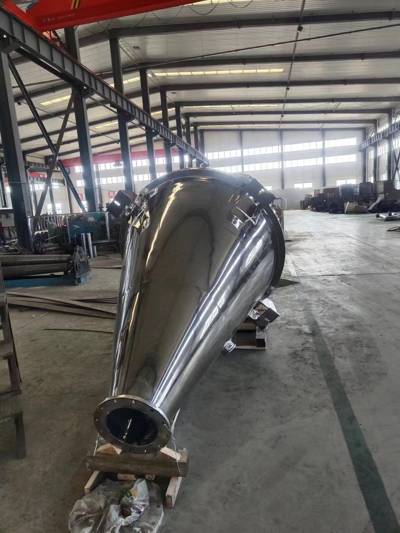 由加熱錐體設有加熱夾套,熱源為熱水、導熱油或低壓蒸汽,從而使錐體內壁保持溫度。變頻調速電機經(jīng)平行斜齒輪減速機,驅動單螺帶攪拌器旋轉,帶動物料沿錐型筒旋轉并自下而上提升,物料到達至高點后由重力和慣性作用,自動流向旋渦中心回到錐型筒體底部,整個過程使物料在錐型筒體內強制加熱,相對對流、摻混,熱量在物料中相互擴散,使物料不規(guī)則往復運動,完成物料同單螺帶和筒壁表面進行高頻率傳熱交換,在短時間內達到加熱干燥的效果。從而使物料內部水份不斷蒸發(fā),在真空泵的作用下,水蒸汽由真空泵引出,如須回收液體可加冷凝器、回收液儲罐回收。干燥完成后,打開下部的出料閥出料。